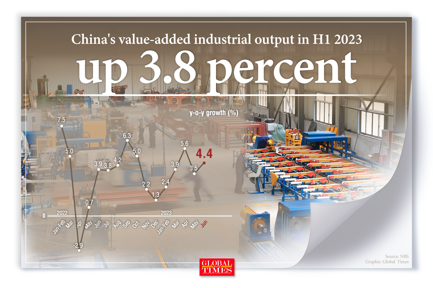 According to the data released by the National Bureau of Statistics (NBS) on Monday, the total value added of the industrial enterprises above the designated size grew by 3.8 percent year-on-year in the first six months, an increase of 0.8 percentage points compared with the first quarter, reflecting accelerated recovery of industrial production and improved business expectations.