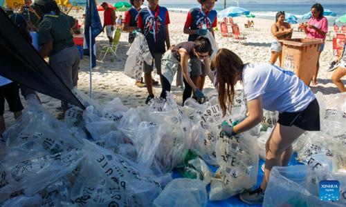 Volunteers sort the collected waste at Sao Conrado Beach in Rio de Janeiro, Brazil, on June 8, 2023, ...