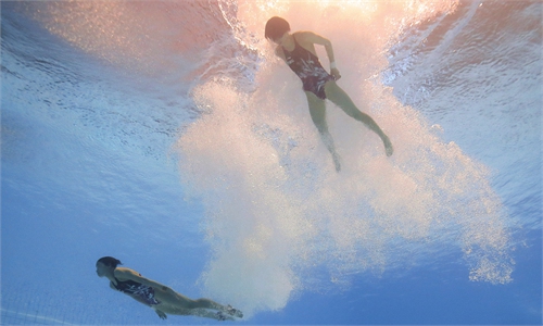 Team China athletes compete in the team acrobatic routine final of artistic swimming at the world aquatics championships in Fukuoka, Japan on July 17, 2023. China won gold with 238.0033 points, a 5.6-point lead on runners-up from the US. Hosts Japan finished third with 220.5867 points. Photo: VCG