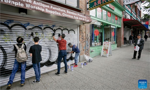 Volunteers cover up graffiti on walls in Chinatown of Vancouver