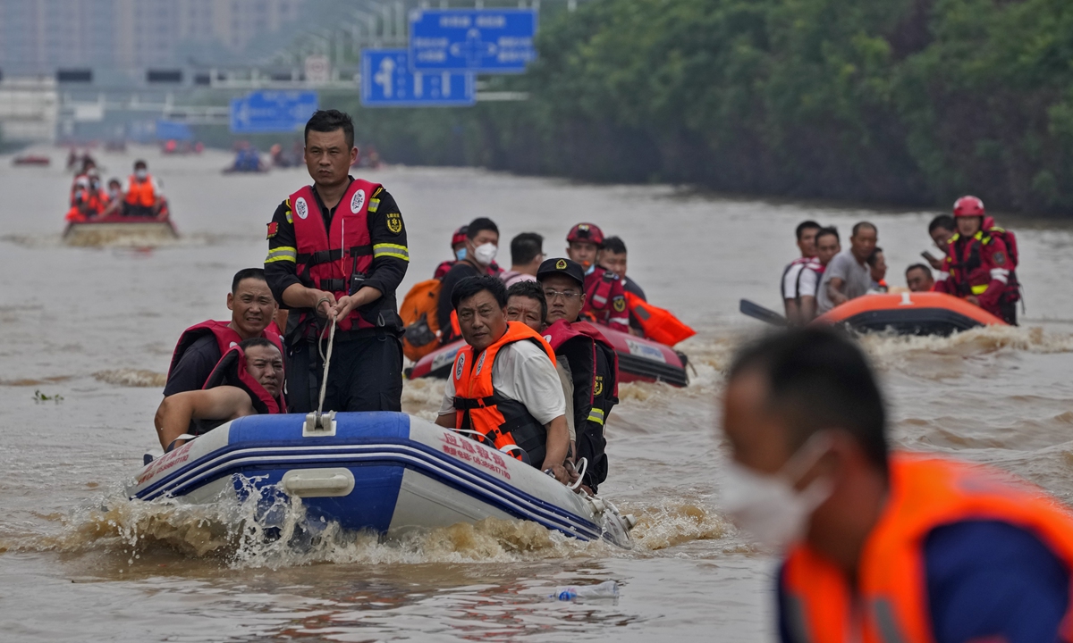 Rescue workers evacuate residents by rubber boats in Zhuozhou, North China's Hebei Province. The region has been hit by floods due to heavy rainfall Photo: IC