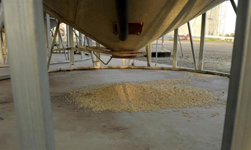 A pile of barley sits beneath a silo at a grain facility in Balliang, Victoria, Australia, on May 18, 2020. Photo: VCG