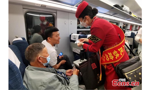 The Fuxing intelligent bullet train tailor-made for the 19th Asian Games Hangzhou 2022 stops at the West Hangzhou Station on August 4, 2023 in East China's Zhejiang Province, with nearly 100 passengers on board for its first trial run. The train has been upgraded with technology adapted to better cater to Zhejiang's terrain, which will provide a more comfortable riding experience for passengers. Photo: Xinhua