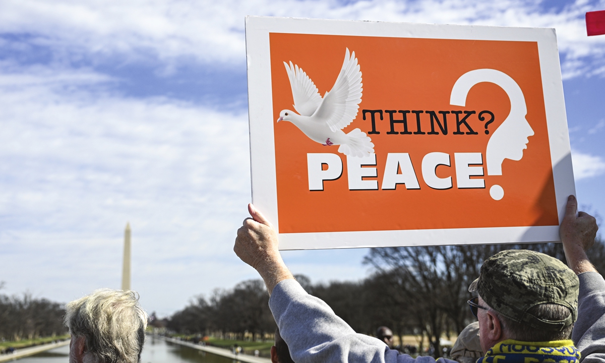 Several hundred protesters gather for an anti-war demonstration to oppose US military aid to Ukraine in front of the Lincoln Memorial in Washington DC on February 19, 2023. The rally's organizers and speakers also called for the Pentagon's budget to be slashed and NATO to be disbanded. Photo: VCG