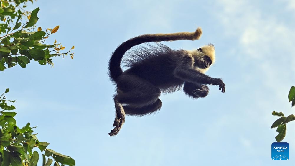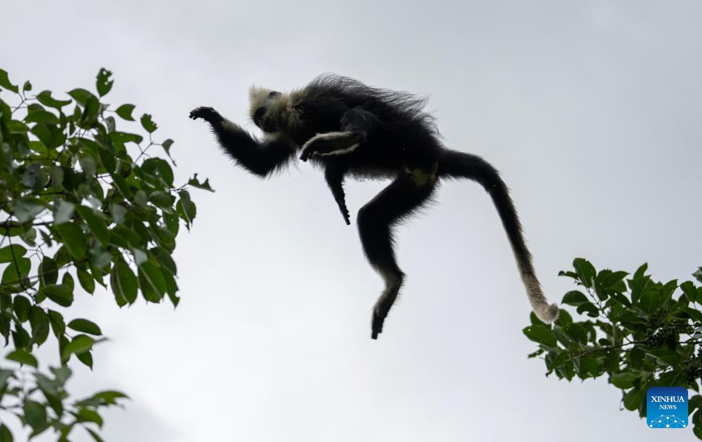 A white-headed langur leaps at a national nature reserve in Luobai Town of Jiangzhou District, Chongzuo City, south China's Guangxi Zhuang Autonomous Region, Aug. 5, 2023. The white-headed langur is one of the world's most endangered primate species and exclusive to China. The endangered animal, characterized by the white hair on their heads, are spotted in the karst hills between the Zuojiang and Mingjiang rivers in the city of Chongzuo, Guangxi.(Photo: Xinhua)