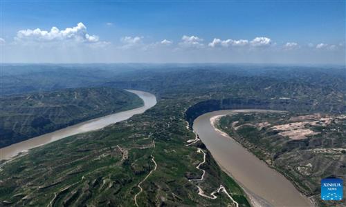 This aerial photo taken on Aug 3, 2023 shows a scene of a turning of the Yellow River in the border area between Shilou County of north China's Shanxi Province and Qingjian County of northwest China's Shaanxi Province. Photo:Xinhua