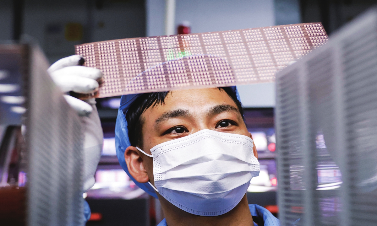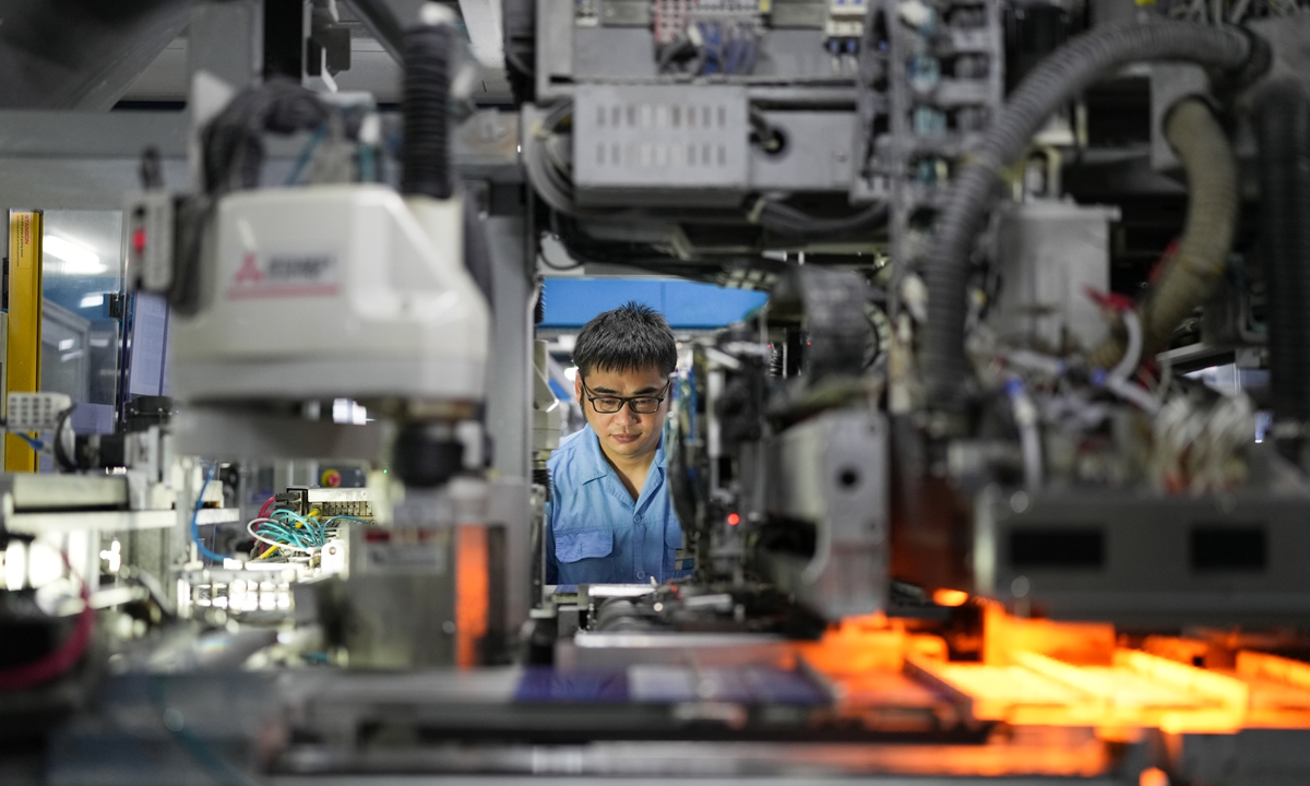 A worker operates a fully automatic welding machine used in solar cell production at a privately owned factory in Taizhou, East China's Zhejiang province, on August 9, 2023. Photo: Xinhua