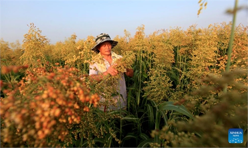 A farmer sorts newly harvested rice in Rongshui Miao Autonomous County in South China's Guangxi Zhuang Autonomous Region on August 9, 2023. The sown area of this year's ??summer grain in Guangxi amounted to 1.801 million mu (120,000 hectares), a year-on-year increase of 1.78 percent, and the total output reached 290,000 tons, up 5.07 percent year-on-year. Photo: VCG