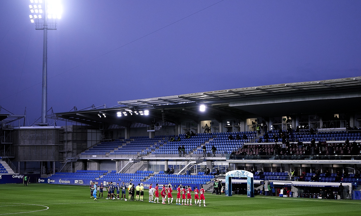 Players stand on the pitch prior to a match at SD Huesca's Estadio El Alcoraz, in Huesca, Spain. Photo: VCG