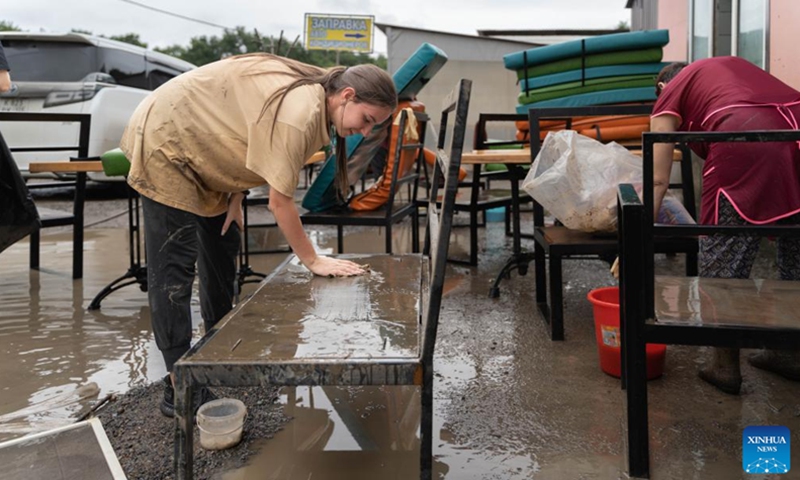 A staff member of a restaurant cleans a furniture soaked by flood water in Ussuriysk, Russia, Aug. 15, 2023. Typhoon Khanun triggered severe floods in Primorsky Krai of Russia's Far East, prompting 21 municipalities to declare a state of emergency, the Russian Ministry of Emergency Situations said on Sunday. The typhoon brought heavy rainfall to Primorsky Krai from Aug. 9 to 11.(Photo: Xinhua)