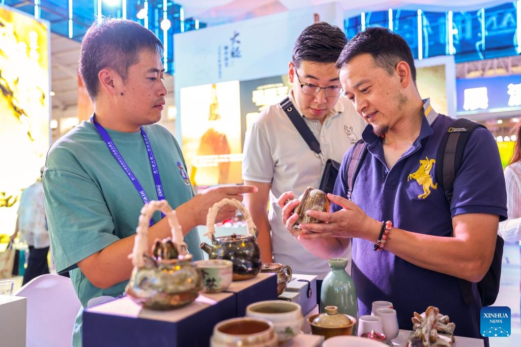 An exhibitor (L) introduces pottery products to visitors at the 7th China-South Asia Exposition in Kunming, southwest China's Yunnan Province, Aug. 17, 2023. The 7th China-South Asia Exposition opened here on Wednesday.(Photo: Xinhua)