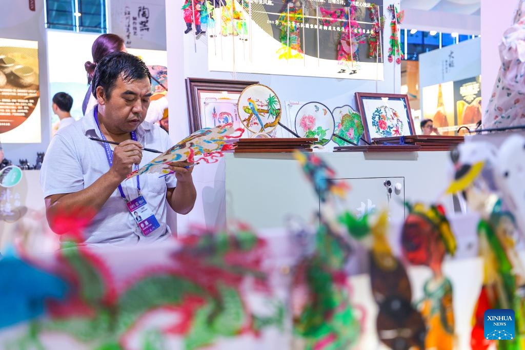 An exhibitor paints a Chinese shadow puppet at the 7th China-South Asia Exposition in Kunming, southwest China's Yunnan Province, Aug. 17, 2023. The 7th China-South Asia Exposition opened here on Wednesday.(Photo: Xinhua)
