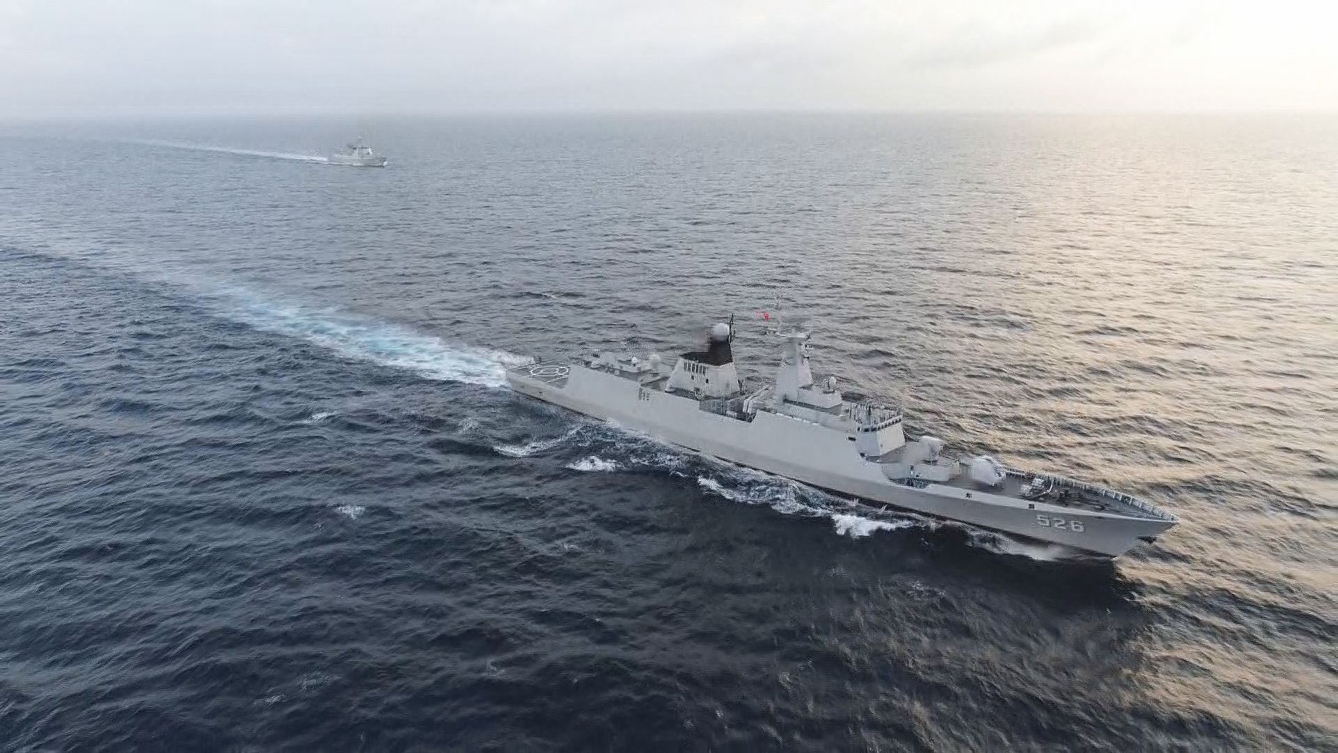 To the north of Taiwan island, PLA destroyers and frigates took advantageous positions through high-speed maneuvering and stealth approaching and launched mock strikes on hostile maritime targets.