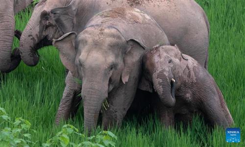 Border police of Mengman township, Xishuangbanna Dai Autonomous Prefecture received a report recently that four wild Asian elephants were roaming around a village in the town. When the police arrived at the site, they found that one of the elephants stopped and carefully sniffed in an area of grass, and then used its trunk to toss a backpack out of the grass, while also making some "calls."