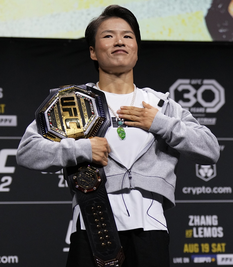 Zhang Weili poses on stage during the UFC 292 press conference on August 17, 2023 in Boston, the US.