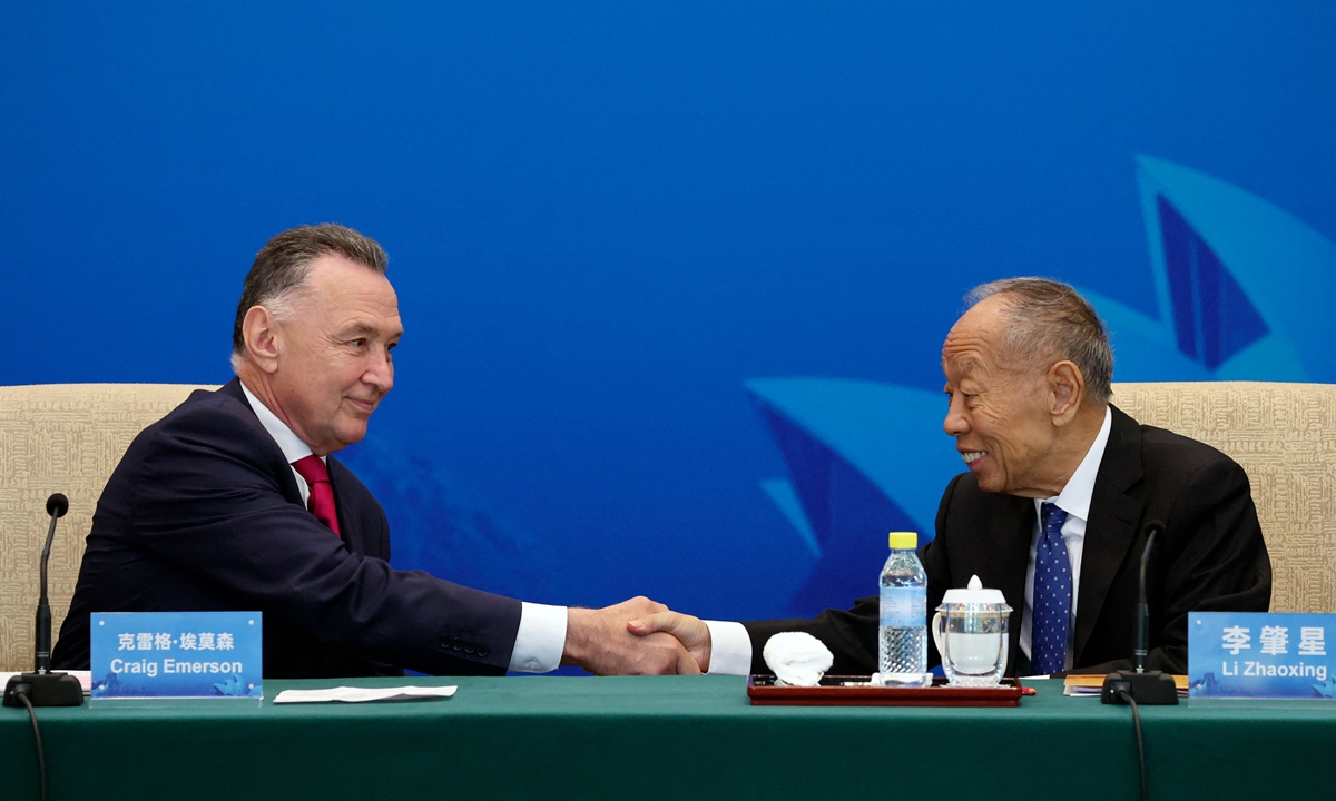 Head of Chinese delegation Li Zhaoxing and head of Australian delegation Craig Emerson shake hands at the 7th China-Australia High Level Dialogue at the Diaoyutai State Guesthouse in Beijing on September 7, 2023. Photo: VCG