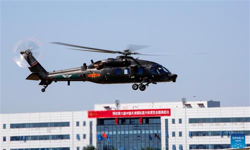 A People's Liberation Army team puts on a performance in Z-10 attack helicopters during the 6th China Helicopter Exposition in north China's Tianjin Municipality, September 15, 2023. Photo: Xinhua