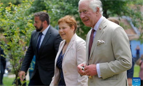 French Prime Minister Elisabeth Borne (right) greets the UK's King Charles III and Queen Camilla (center) on their arrival at Orly Airport in Paris on September 20, 2023, on the first day of a state visit to France. King Charles III and his wife Queen Camilla are on a three-day state visit to France meant to highlight the friendship between the two countries with great pomp. Photo: VCG