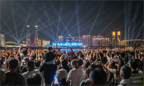 People gather at the promenade of Qiantang River to watch the light show of the Hangzhou Olympic Sports Centre Stadium (C), ahead of the 2022 Asian Games in Hangzhou in East China's Zhejiang Province on September 19, 2023. Photo: VCG