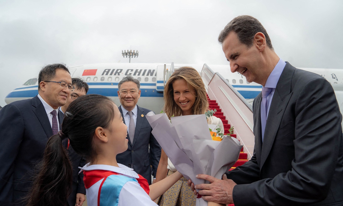 A handout picture released by the official Syrian Arab News Agency shows Syrian President Bashar al-Assad and First Lady Asma al-Assad being welcomed upon their arrival at the airport in Hangzhou, capital city of ?East China's Zhejiang Province, on September 21, 2023. Bashar arrived in the scenic city to attend the opening ceremony of the 19th Asian Games to be held on September 23.?Photo: VCG