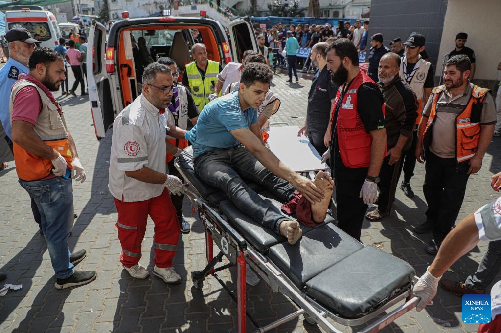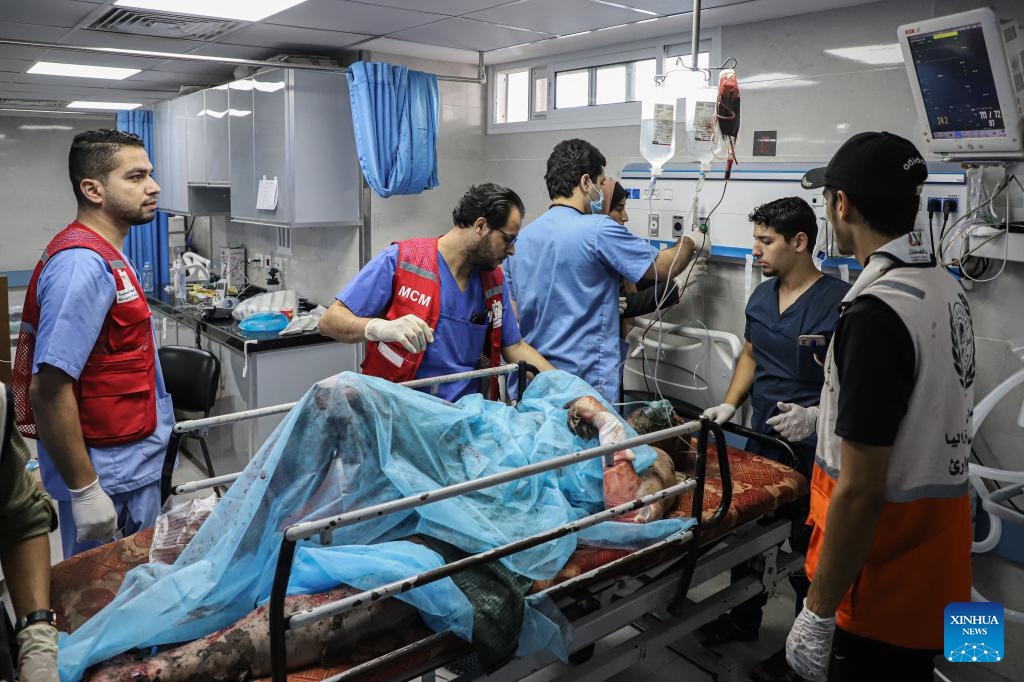 Medical staff transfer an injured man at a hospital after Israeli airstrikes in Gaza City, Oct. 17, 2023. Since the bloody conflict between Hamas and Israel began on Oct. 7, a total of 2,808 Palestinians have been killed and 10,850 others wounded, according to figures released by the Hamas-run health ministry.(Photo: Xinhua)