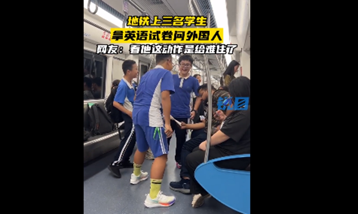 A video of three students consulting a foreigner with an English test paper on the subway in South ...