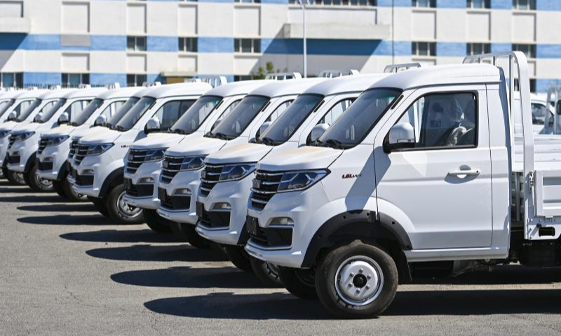 This photo taken on July 26, 2023 shows domestically-made vehicles at the Horgos Port in northwest China's Xinjiang Uygur Autonomous Region. More and more domestically-made automobiles have been exported through the Horgos Port, one of China's closest ports to Central Asia and Europe by land transport, to countries along the Belt and Road, including Kazakhstan, Uzbekistan and Russia. (Xinhua/Ding Lei)