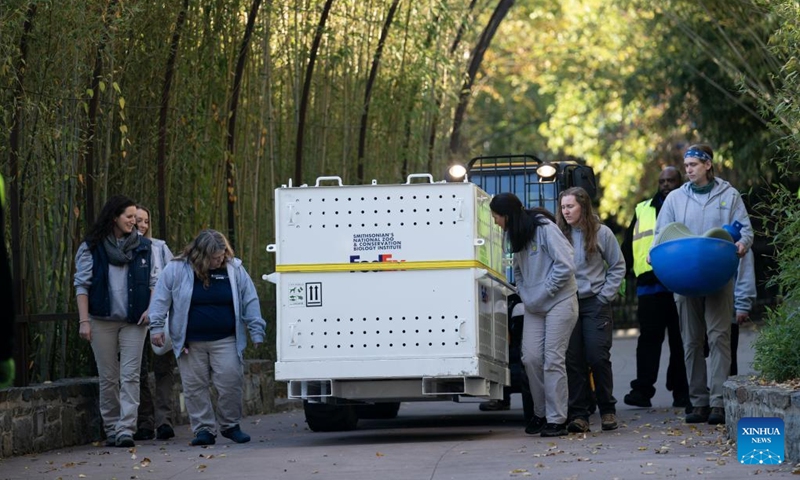 Staff members transfer a cage holding giant panda Mei Xiang at the Smithsonian's National Zoo in Washington, D.C., the United States, Nov. 8, 2023.(Photo: Xinhua)
