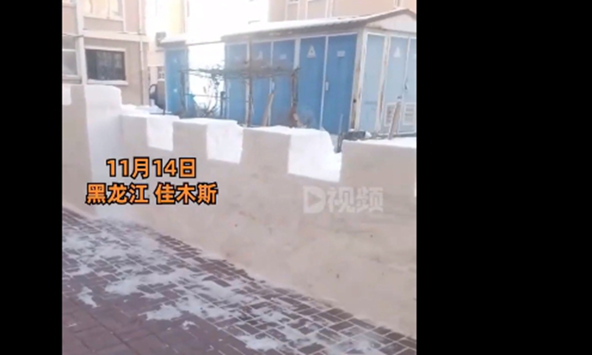 A 64-year-old man surnamed Zou in Jiamusi, Northeast China's Heilongjiang Province, used his free time to build a 20-meter-long snow wall with the accumulated snow in the neighborhood. Photo: web