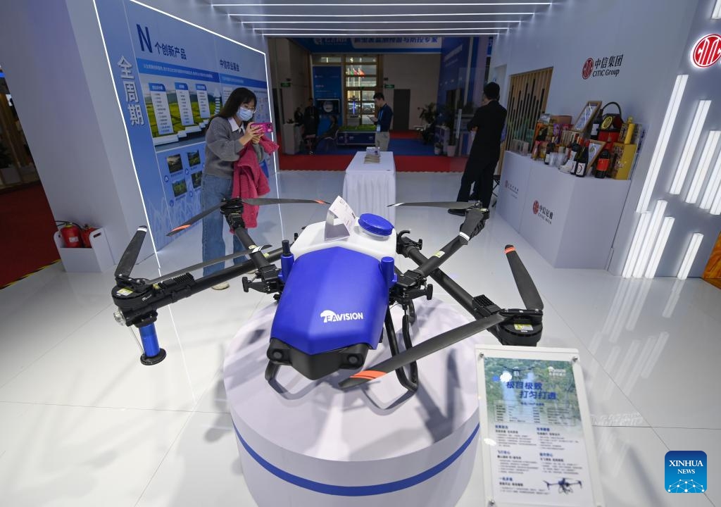A visitor takes photo of a drone for plant protection at the exhibition area on green agriculture chain during the China International Supply Chain Expo (CISCE) in Beijing, capital of China, Nov. 30, 2023. The green agriculture chain exhibition area focused on core links, key technologies and products of the agricultural industrial chain, seed research and development, smart agricultural applications, intelligent agricultural machinery and equipment, regionally distinctive agricultural processed products, and agriculture-related financial and logistics services.(Photo: Xinhua)
