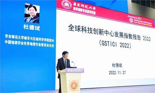 Du Debin, director of the East China Normal University Institute for Global Innovation Studies and chairman of Shanghai Society for Science of Science delivers the ranking of Top 100 Global Science and Technology Innovation Centers 2023 on December 2, 2023. Photo: Du Qiongfang/GT