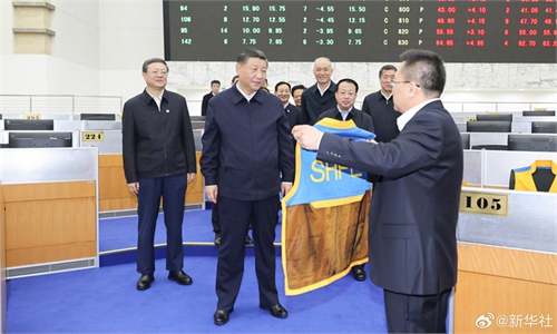 Chinese President Xi Jinping, also general secretary of the Communist Party of China (CPC) Central Committee and chairman of the Central Military Commission, inspects an exhibition on Shanghai's sci-tech innovations, in east China's Shanghai, Nov. 28, 2023. Xi made an inspection tour in east China's Shanghai from Tuesday to Wednesday. During his trip, Xi inspected the Shanghai Futures Exchange, an exhibition on Shanghai's sci-tech innovations, and a government-subsidized rental housing community, learning about the city's efforts in strengthening its competitiveness as an international financial center, building the city into an international sci-tech innovation center, and constructing government-subsidized rental housing projects. Photo: Xinhua