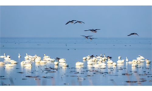 A rescued oriental white stork is released into the wild during a rescue and release event for migratory birds in Jiujiang, East China's Jiangxi Province, on December 10, 2023. A total of 60 birds from 19 species were released during the event, including 10 wild animals under first-class national protection and 16 under second-class national protection. Photo: VCG