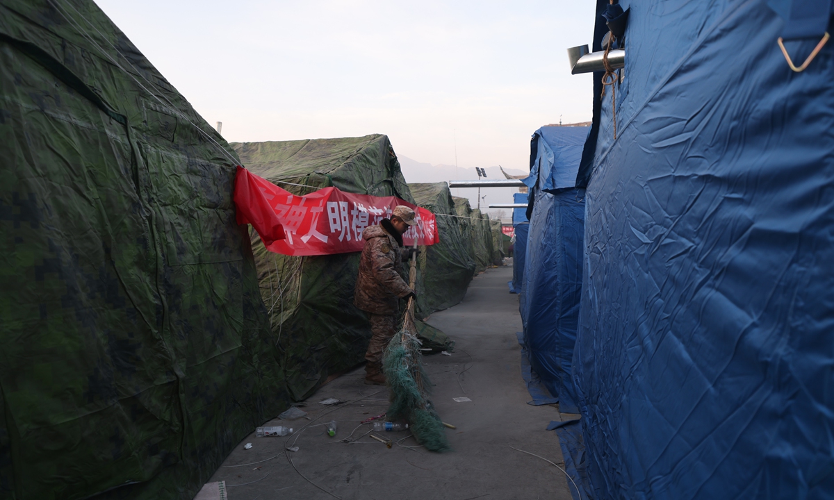 Government employees, soldiers from the PLA and volunteers are racing against time and the cold to erect tents for earthquake victims. In Dahe village, Jishishan county, a PLA soldier told the Global Times that they make sure every tents has stoves to keep victims warm.