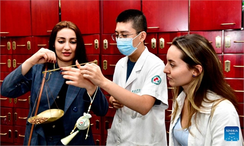 Pupils experience weighing traditional Chinese medicine (TCM) at a TCM store in Shijiazhuang, North China's Hebei Province, on October 20, 2022. The World Traditional Medicine Day falls on October 22, 2022. The practice of TCM has spread to 196 countries and regions, and China has signed specialized cooperation agreements on TCM with over 40 countries, regions and international organizations. Photo: CFP