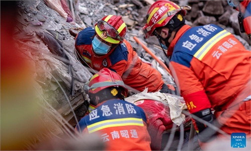 Rescuers work together to search and save victims from the ruins after landslide in Zhenxiong, Southwest China's Yunnan Province, on January 22, 2024. Photo: VCG