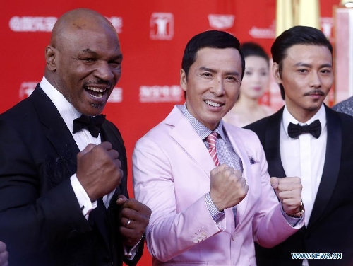 Leading casts of the movie "Ip Man 3" Donnie Yen (C) and Mike Tyson (L) walk the red carpet at the 18th Shanghai International Film Festival in Shanghai, east China, June 13, 2015. The 9-day festival kicked off on Saturday. (Xinhua/Ding Ting)