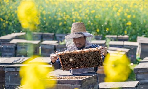 A farmer works in an apricot orchard in Zunhua city, North China's Hebei Province on April 6, 2024. As the city's apricot trees blossom, local farmers seize the time for pollination, fertilization and watering, laying a good foundation for a bumper harvest of white apricots. Photo: cnsphoto