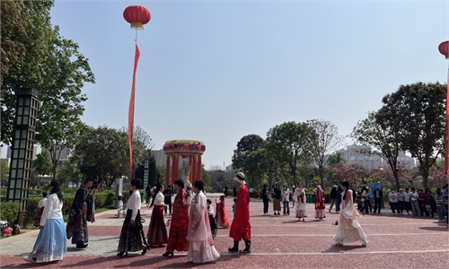 People celebrate the Double Third Festival with a dancing show in South China's Guangxi Zhuang Autonomous Region on April 11, 2024. Photo: Courtesy of Guangxi Daily