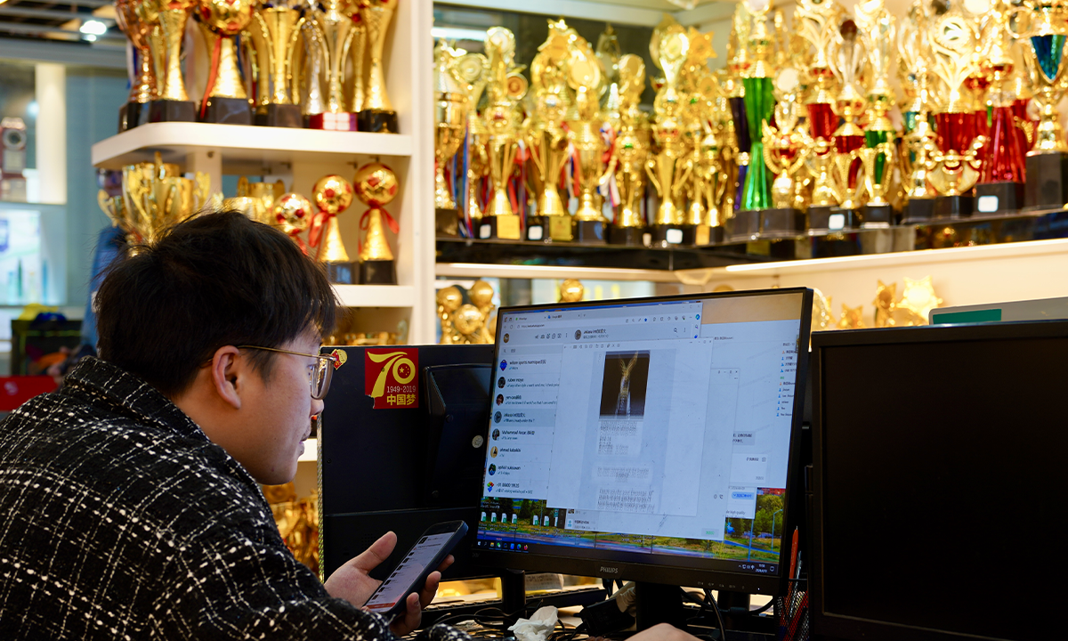 A merchant selling trophies checks online orders on April 10, 2024, in Yiwu, East China's Zhejiang Province. As the Paris 2024 Olympic Games draws near, some merchants selling sports-related products have seen a spike in export orders. Photo: cnsphoto