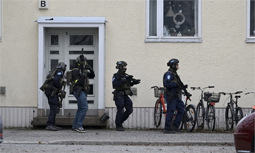 Finnish police investigate the scene at Viertola comprehensive school where a child opened fire and killed one and ...