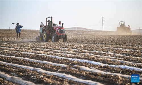 A worker inspects spring rice seedlings in an automated seedling breeding plant in Guangshan county, Central China's Henan Province on April 14, 2024. In recent years, the county has implemented automated seedling breeding technology and systems to enhance the efficiency and quality of seedling cultivation in the region. Photo: VCG