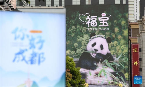 South Korean visitors queue to bid farewell to Fu Bao, a giant panda on dis play for her final day at the Panda World of Everland Resort in Yongin, South Korea, on March 3, 2024. Photo: cnsphoto Inset: Giant panda Fu Bao eats bamboo at the Panda World of Everland Resort on March 3, 2024 in Yongin, South Korea. Photo: VCG