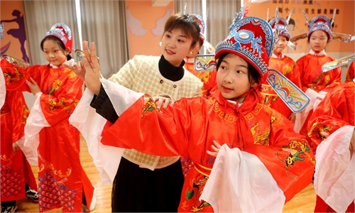 A teacher guides students in a traditional Chinese drama performance at an elementary school in Lianyungang, East China’s ...