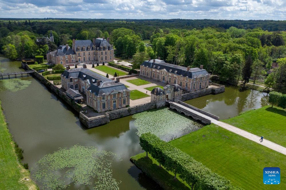 An aerial drone photo taken on April 28, 2024 shows the view of La Ferte Saint-Aubin Castle in Loire Valley, France. The chateaux of the Loire Valley are part of the architectural heritage of the historic towns of Amboise, Angers, Blois, Chinon, Montsoreau, Orleans, Saumur, and Tours along the river Loire in France. They illustrate Renaissance ideals of design in France.(Photo: Xinhua)