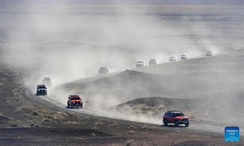 Tourists drive off-road vehicles in Urho District of Karamay, northwest China's Xinjiang Uygur Autonomous Region, May 2, 2024. ...
