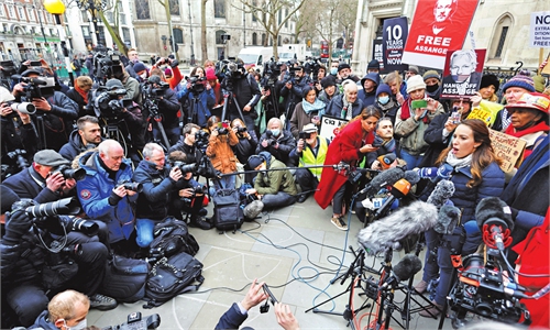 Supporters of WikiLeaks founder Julian Assange hold banners and placards as they protest in support of him outside UK's High Court in central London on May 20, 2024. Assange has reportedly won a victory in his ongoing battle against extradition from the UK to the US after judges at the High Court in London granted him permission to appeal. Photo: AFP