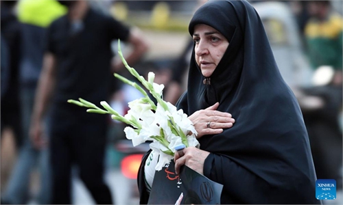 People mourn victims of the helicopter crash near Varzaqan County, in Tehran, Iran, on May 20, 2024. Iranian President Ebrahim Raisi and some members of his accompanying team, including Foreign Minister Hossein Amir-Abdollahian, were confirmed dead Monday morning as the wreckage of the helicopter carrying them was found following its crash in bad weather on Sunday near Varzaqan County. Photo: Xinhua