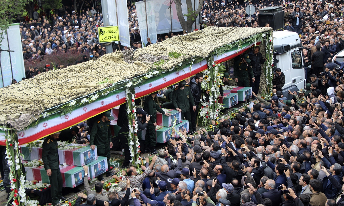In this photo provided by Fars News Agency, mourners gather around a truck carrying the coffins of Iranian President Ebrahim Raisi and his companions who were killed when their helicopter crashed on May 19, 2024 in a mountainous region of the country's northwest, during a funeral ceremony at the city of Tabriz, Iran on May 21, 2024. Photo: VCG