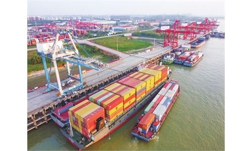 Employees assemble a batch of port container cranes for export at the Taicang Port of Suzhou, East China's Jiangsu Province on May 21, 2024. In the first quarter, Taicang Port handled 27.3 million tons of foreign trade cargo, up 3.12 percent year-on-year, a good start for the year. Photo: VCG